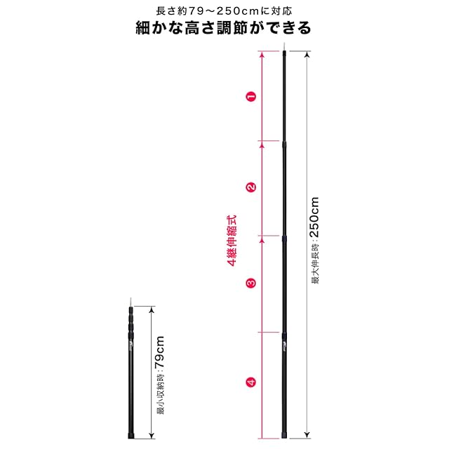 ✅【細かな高さ調節ができる】 4つのシャフトを重ねた4継無断階調節式を採用。高さは79~250cmの間でお好みの高さに設定できます。また収納時もコンパクトに収まるので持ち運びラクラク!
