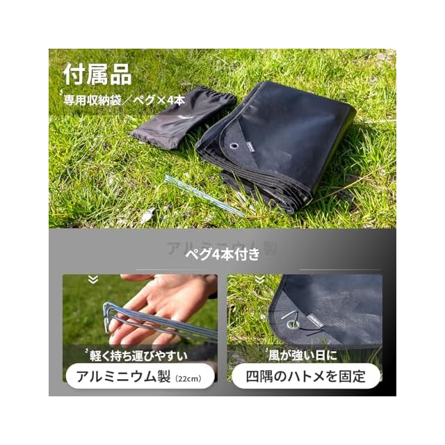 【収納袋付き】シートに土汚れが付いても収納袋に入れれば車内・家の中へ汚れを落とさずに済みます。また、付属ペグもまとめて収納できるので紛失の心配もありません。収納袋は薄いポリエステル素材ですので非常に軽く、持ち運びの邪魔になりません。(重量:12g(収納袋のみ))
