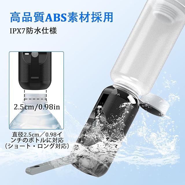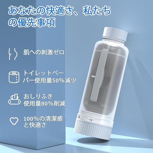 【IPX7完全防水仕様】この携帯ウォシュレットは厳格なIPX7防水規格に準拠し、水回りでの使用にも完全対応。シリコンノズルとABS製ボトルは丸ごと水洗い可能で、常に清潔な状態を維持できるウォシュレット 携帯です。ワイドノズルが広範囲を効率よくカバーし、心地よい水流で洗浄後のさっぱり感を持続させます。