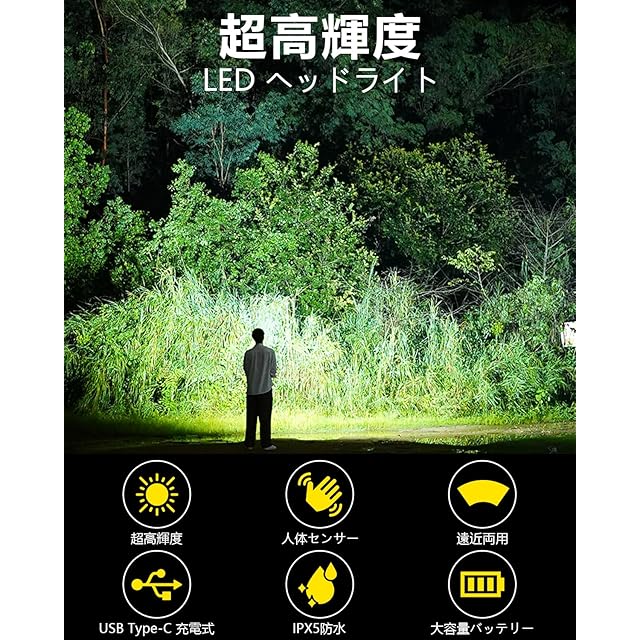 ヘッドライト Type-C 充電式 ledヘッドライト 高輝度 2000mAh 五つ点灯モード センサー機能付き 防水 照射角度調整可 超軽量 釣り ヘッドランプ 登山 キャンプ 散歩 アウトドア 災害 停電用