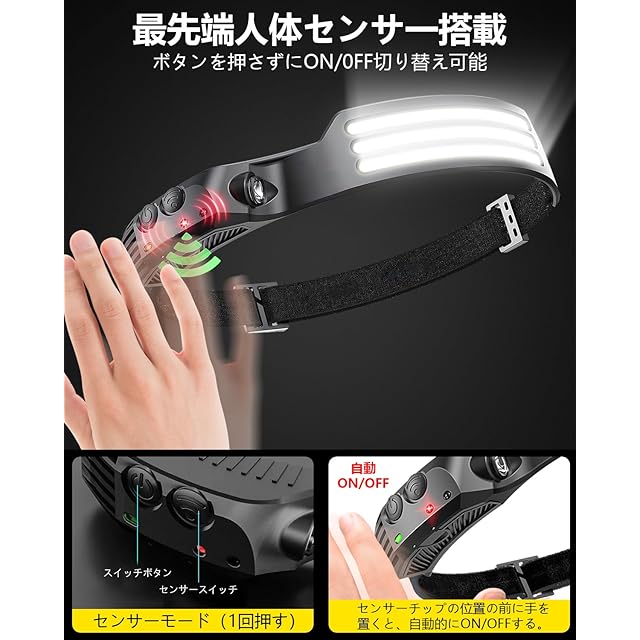 【ハンズフリー操作に便利なセンサーモード搭載】センサーモードをオンにすれば、手をかざすだけでライトのON/OFFが可能。手袋をしているときや両手が塞がっている状況でも、スムーズにライトを操作できます。