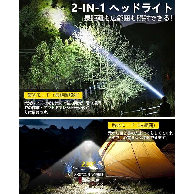 【驚異の高輝度1000ルーメン&照射角度自由調整】最大1000ルーメンの明るさで、最大照射距離は約150メートル。ヘッド部分は上下に角度調整可能で、足元はもちろん、前方広範囲まで明るく照らします。夜道やアウトドアの暗闇でも、安全確保に役立ちます。