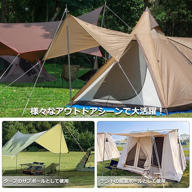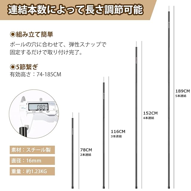 ✅【5段連結式で収納もラクラク】:1本のタープポールは5本継ぎで、収納時はわずか41cm!5段連結式のデザインで、最短74cm~最長185cmまで4段階の長さ調節ができます。重量は約1.2KGで、女性でも簡単に持ち運べるコンパクト設計です。旅行やキャンプの際も場所を取らず、便利に携帯できます。