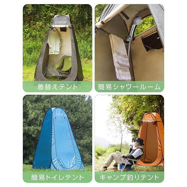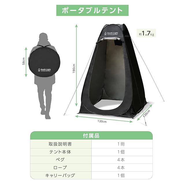 【幅広い用途&製品仕様】本製品は更衣室としてだけでなく、简易トイレやビーチテントのシャワー室としても幅広く活用できます。 型番:sl-lyzp01 色:ブラック 材質:ポリエステル(シート、ロープ)、スチール(フレーム、ペグ) サイズ:組立時 約W120×D120×H190㎝ 同梱品:テント本体×1、ペグ×4、ロープ×4、収納バッグ(ポリエステル製)×1