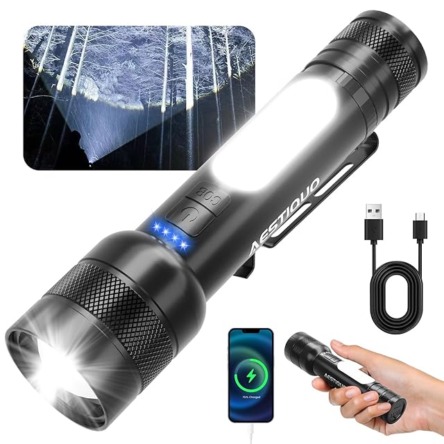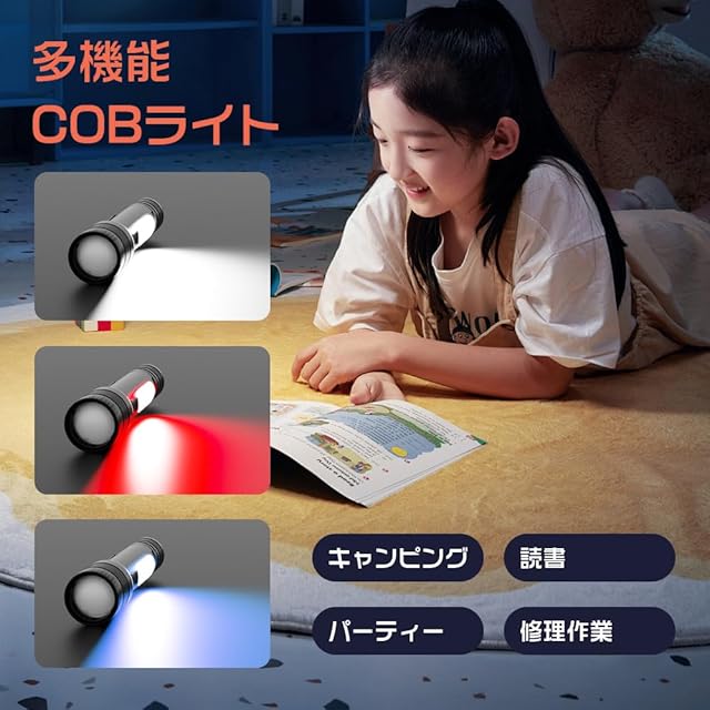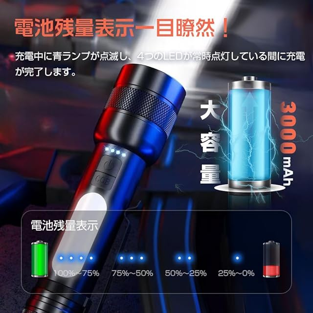 懐中電灯 強力 防災【 25000ルーメン 白色/赤色/青色のCOB作業灯付き】超高輝度 ハンディライト9モード調光 Type-C USB充電式 IP56防水防塵 軽量 小型 大容量 最強 LED 高輝度 SOS フラッシュライト ズーム式 アルミニウム合金 耐衝撃2M 新型 残量表示機能 自転車 登山 夜釣り 作業用 停電 地震 避難対策