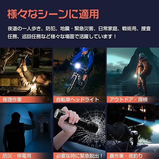 【高品質IP56防水防塵】軍用超高硬度のアルミ合金を採用され、本体頑丈で耐衝撃性に優れ、防災や自衛などに使用可能です。日常生活の雨水などによる水滴の付着や飛沫程度なら、懐中電灯本体に悪影響なく耐えることができます。(水に浸さないでください)。アウトドア・キャンプ・登山・防犯・防災・地震対策・停電時などに大活躍しています。