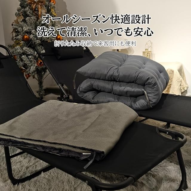 【洗濯可能な大きなマットレスと多様なオプションで快適と便利を両立】:この折りたたみベッドは、「洗える大判マットレス」 と 「充実のオプション」 で快適さと便利さを両立。さらに今回はメインマットレスにパール綿を増量填充し、より分厚くしっかりとした支撑感が実現しました。さらに安定性も進化。すべり止め支撑脚を6か所に強化したので、より安心でグラつきのない使用感をお届けします。 ベッドにぴったりフィットする大判マットレスは寝返りでもずれにくく、何と言っても丸洗いできるので清潔を保てるのが魅力。肌寒い季節もマットレスを追加する必要はありません。さらに、お好みに応じて寝心地をカスタマイズ可能な豊富なオプションをご用意:肌触りが良く柔らかな綿パッド、着脱可能で通気性バツグンの涼感ネット、さらに4D通気パッドや極厚パール綿パッドなど、お客様のライフスタイルと季節に合わせて最適な快適さをお選びいただけます。