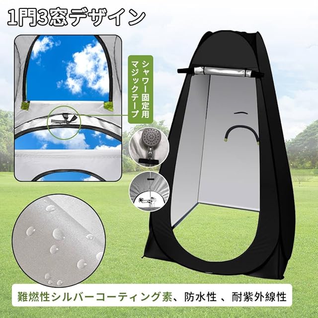 【1門3窓・展開スペース広い】テントのサイズは約120×120×190cmと、大人が手を挙げても邪魔にならない余裕のゆったりスペースなので、着替えやシャワーが楽々です。合計3つの小窓をついており、通気性が良くて、テント内は蒸し暑くならないし、周りの様子も確認できます。