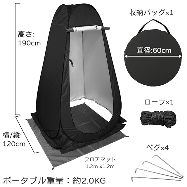 【1門3窓・展開スペース広い】テントのサイズは約120×120×190cmと、大人が手を挙げても邪魔にならない余裕のゆったりスペースなので、着替えやシャワーが楽々です。合計3つの小窓をついており、通気性が良くて、テント内は蒸し暑くならないし、周りの様子も確認できます。付属品:ペグ*4本 、ロープ*1本、収納バッグ*1、フロアマット*1。