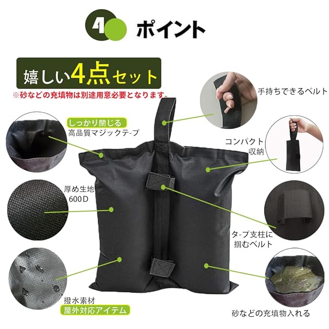 【4個セット】ペグが打ちにくい場所や、キャンプ時のテントやタープのポールに活躍、砂を入れて砂袋や土嚢おもしにしたり、水の入ったペットボトル(ウォーターバッグ、ウォータータンク)、石などを詰めて、タープテントの足の固定のテントウエイト(おもり)に!