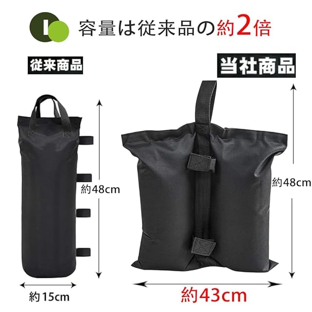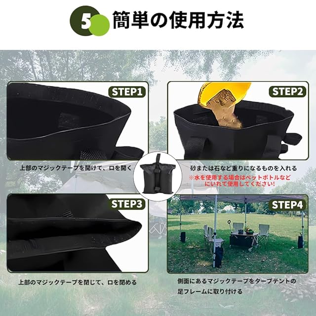 【使いやすい設計】ウエイトバッグは、頑丈なマジックテープが装備されています。テント やタープポールを簡単に掴めできます。