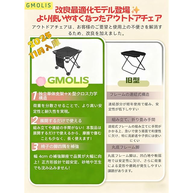 【細部の改善、性能の向上】アウトドアチェアの質感を向上されるために、折りたたみ椅子の細部を改良しました。キャンプチェアの安定性を高めるため、ブラケットの4辺はすべてX字型を採用された。伝統的なアウトドアチェアの脚先は丸点を帯びているが、GMOLISキャンプチェアは4cm幅の正方形足先を採用して、芝地に沈み込みを防ぐ。アウトドア椅子の足が高品質のコーティングを装置し、酸化やサビを防止しなど、損傷の可能性を減らし、バランスを崩すことなくアウトドアにも安定して座り続けられました。