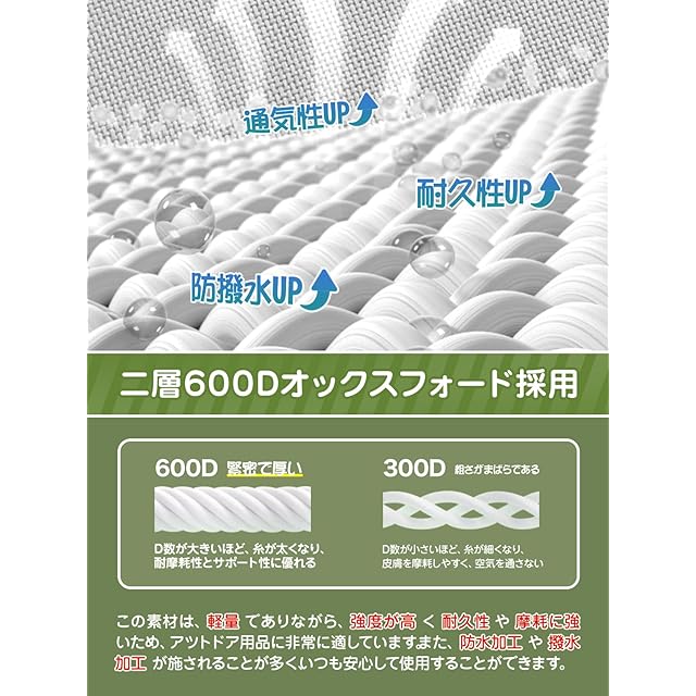 【プロ仕様の高耐久600Dオックスフォード素材】業界標準より高密度な600Dオックスフォード生地を採用したアウトドアチェア。耐摩耗性に優れ、岩場や灌木の多い環境でも傷つきにくく、撥水加工で突然の雨も簡単にふき取れます。