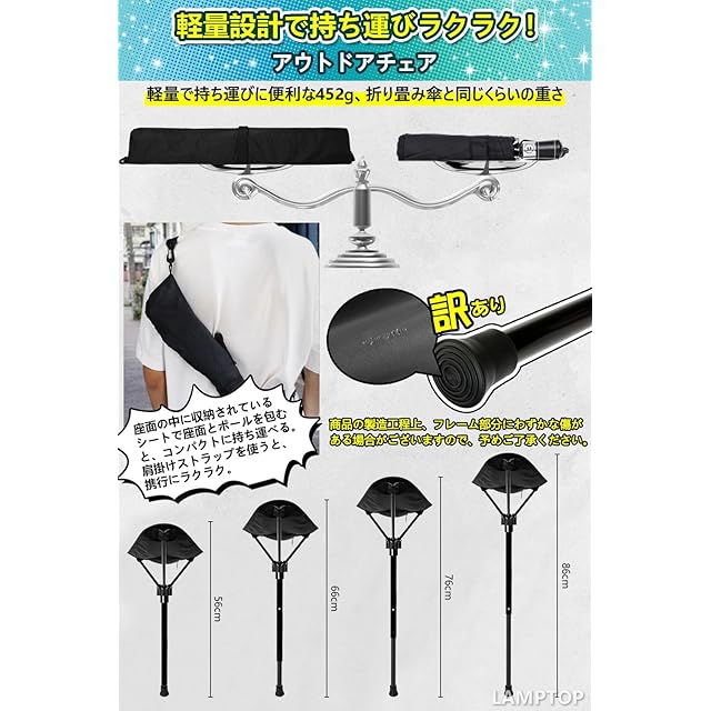 【立ったまま座れる】LAMPTOPアウトドアチェア 軽量 折りたたみ椅子【高さ56/66/76/86cm調節可能/耐荷重120kg】 スタンディングチェア コンパクト 携帯 持ち運び便利 高い 収納袋付 アルミ製 ゴルフ観戦 登山 お釣り お花見 一本足 ブラック