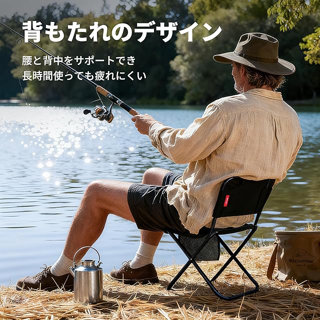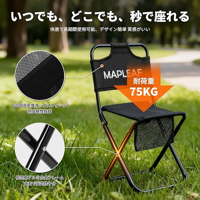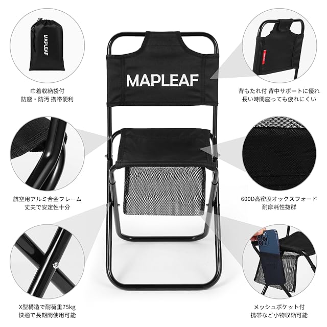 Mapleaf アウトドアチェア 折りたたみ椅子 背もたれ コンパクト 超軽量 耐荷重75kg 1秒収納 収納バッグ付き 持ち運び 携帯便利 釣り バーベキュー 登山 キャンプ ピクニック お花見 (ブラック(1pcs))