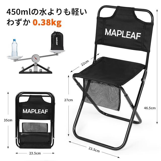 【超軽量&コンパクト】総重量:約0.38kg、サイズ:約W23.5×D22×H46.5cm、収納サイズ:約W35×D23.5×H4.5cm。椅子本体の総重量はわずか0.38kg、500mlペットボトル天然水より軽いです。折り畳むとA4雑誌とサイズ相当、車にストレスなく積み込むことができる薄型設計。専用収納袋も付なので、長時間でも疲れなくて持ち運びしやすいです。