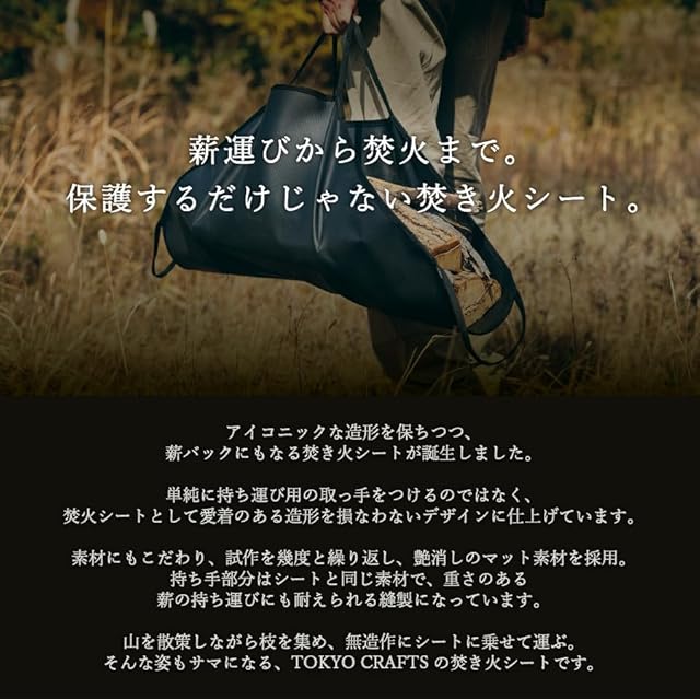 【薪運び・焚き火・灰処理をスムーズに】 TOKYO CRAFTSの焚き火シートは、耐熱600度のガラス繊維素材を使用し、焚き火やバーベキューで発生する火の粉や灰から地面をしっかりと保護します。ただ地面を保護するだけでなく、薪バッグとして薪を持ち運び、灰の後片付けもさっと行える便利な多機能なデザインです。シリコンコーティングにより汚れが付きにくく、お手入れも非常に簡単です。※注意事項をよく読みご購入ください