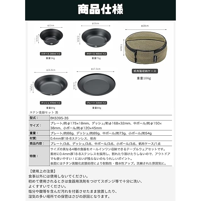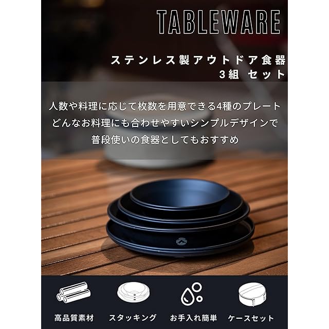 特徴:サイズの異なる4種計12点の食器をオールインワン収納できるテーブルウェアセットです。 素材に0.4mm厚18-8ステンレスを採用し、割れたり溶けたりしないので、アウトドアでも使いやすい!においが残らないのもうれしいポイント。