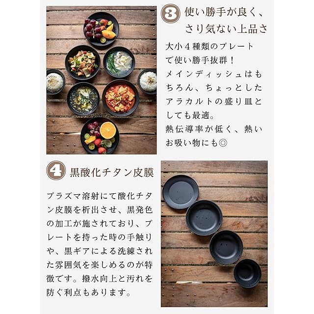 【多用途プレート】大小4種類のプレートがあり、キャンプ料理のメインディッシュからサイドまで幅広く対応します。