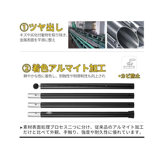 分割式ポール+プッシュアップトップ節:4節連結タイプで長さ調整範囲が120cm~280cmの間で27段階まで長さがアレンジできます。 連結本数によって60cmごとに長さ調節可能、120cm・180cm・240cm三段階とプッシュアップトップ節によって5cmごとに長さ調節可能、5cm+5cm+5cm+5cm+5cm+5cm+5cm+5cm八段階で自由に伸縮可能、数多い段階で長さを選べます。ポールの高さと低さを簡単に調整して高低差を作って防雨・防風対策にアレンジできます。
