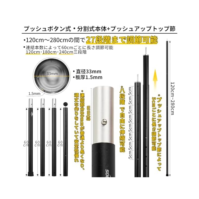 分割式ポール+プッシュアップトップ節:4節連結タイプで長さ調整範囲が120cm~280cmの間で24段階まで長さがアレンジできます。 連結本数によって60cmごとに長さ調節可能、120cm・180cm・240cm三段階とプッシュアップトップ節によって5cm/10cmごとに長さ調節可能、10cm+5cm+5cm+5cm+5cm+5cm+5cm七段階で自由に伸縮可能、数多い段階で長さを選べます。ポールの高さと低さを簡単に調整して高低差を作って防雨・防風対策にアレンジできます。
