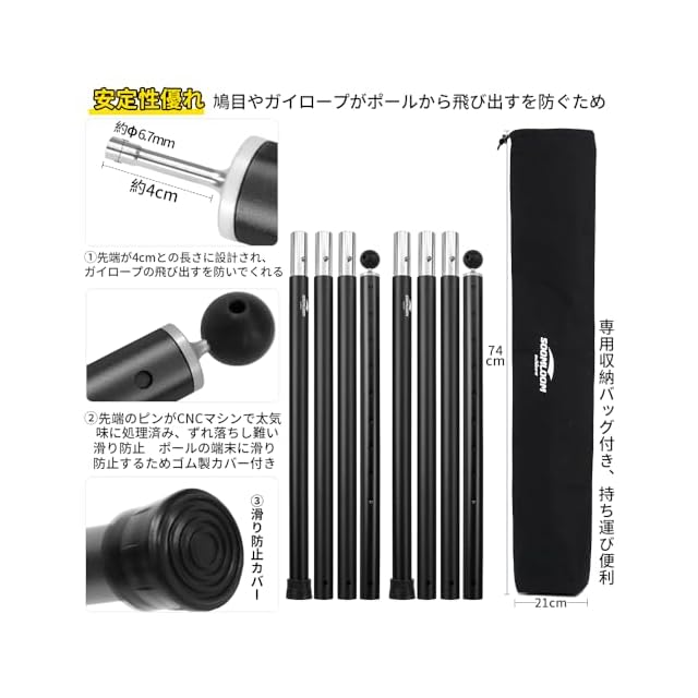 サイズ: 長さ約68cm、直径33mm、厚さ15mm、継手80mmとの頑丈な作りをしていて、折れにくくて、タフで耐久性にも優れ、強風の際、強めのテンションの張りにも耐えられます。収納時ほぼ長さ70cmとのコンパクトサイズに抑えられます。