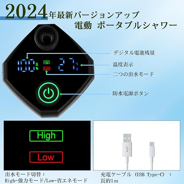【デジタル画面・二つ出水モード】innhom ポータブルシャワーは、デジタルディスプレイが付き、電源残量を正確に把握できるだけではなく、現時点な水温も一目確認できます(加熱機能がない)。【high:強力モード/low:節能モード】の二つモードが切り替えられる節水シャワーです。電源を入れた後、デフォルトモードは強力モードになり、ボタンは緑色に点灯し、画面に「high」を表示します。ボタンをもう一回押すと節能モードに切り替わり、ボタンは赤色に点灯し、画面に「low」を表示します。