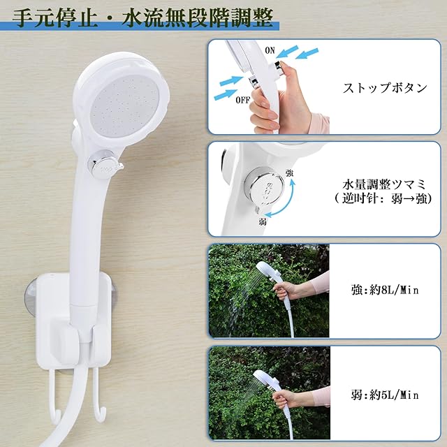 【手元止水・水流無段階調整】ストップボタンを押すだけで一時止水・出水を自由に切り替える一方、水流調整ツマミを回すことで水量を無段階調整できます。他の充電式シャワーとは異なり、ポンプと電源を1つにまとめ、スペースを節約するだけでなく、防水性能も向上させます(IP67防水レベル)