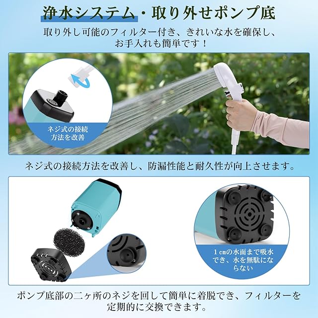 【豊かな商品内容・注意事項】電動シャワーの内容:シャワーポンプx1、シャワーヘッドx1、ホースx1、充電ケーブルx1、フィルターx3(交換用2枚)、Oリングx3(交換用2個)、ホルダx1、吸盤x3、フックx2、収納袋x1、日本語取扱書。※1.シャワーポンプの安全水温は10~60℃です。2.最低水位はポンプ底の水吸込口を超えてください。3.接続前に水漏れを防止するためのOリング(ゴムパッキン)の取り付けることをご確認ください。4.ポンプを水に入れる前に充電ポートにある保護蓋はちゃんと閉めてください。より詳しい注意事項は取扱書にご参考になります。