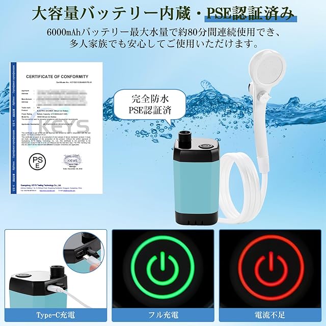 【PSE認証済み・一年】防火素材を採用するポータブル 電動シャワーは日本PSE認証、EN 55014-1、EN 55014-2とRoHS基準等を獲得し、お買い上げ日より一年の安心を提供いたします。商品の品質には万全を期しておりますが、お使用中に不具合などがございましたら、いつでもお気軽に「注文履歴」→「出品者に連絡する」までご連絡ください。