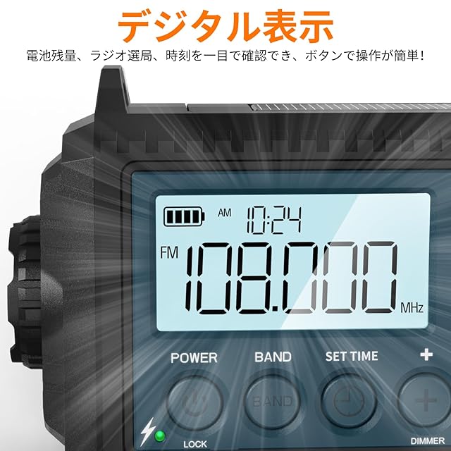 【大型LCDディスプレー&操作便利】残りの電気、チャンネル情報、時間を表示する大きな明るいバックライト付きLCDスクリーンで画面が見やすく操作がしやくなっています。ボタン操作で使用できるので、簡単に操作できます。手回し充電ラジオは、従来の手動チャンネル調整方法を取り除き、信号を明確に受信できるように正しいチャンネルを自動的に検索する機能を追加します。