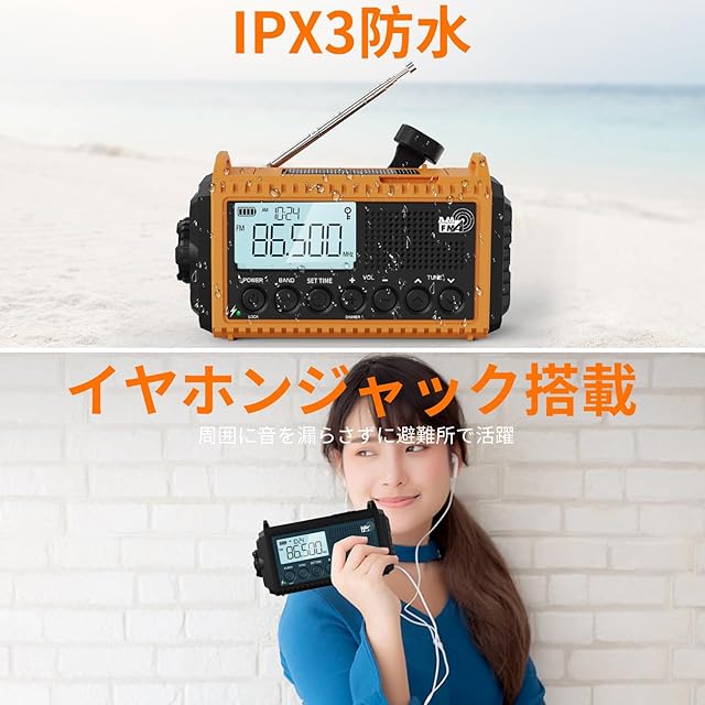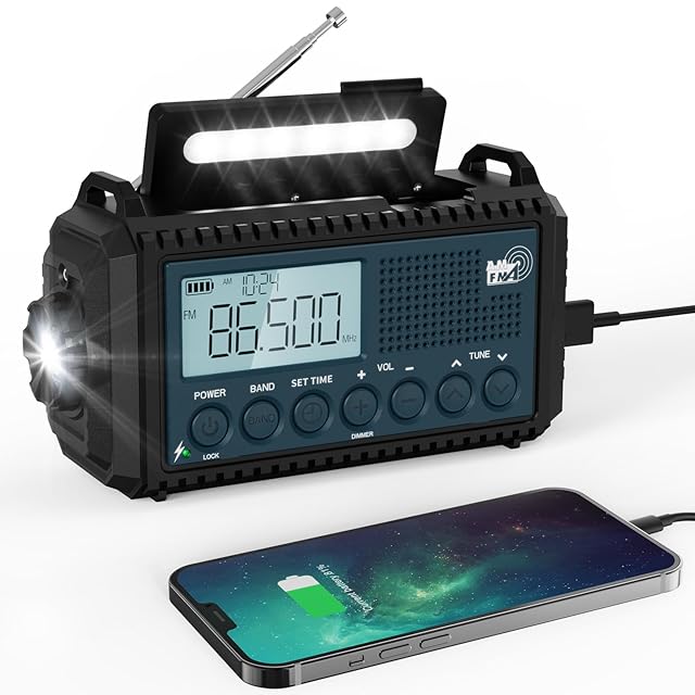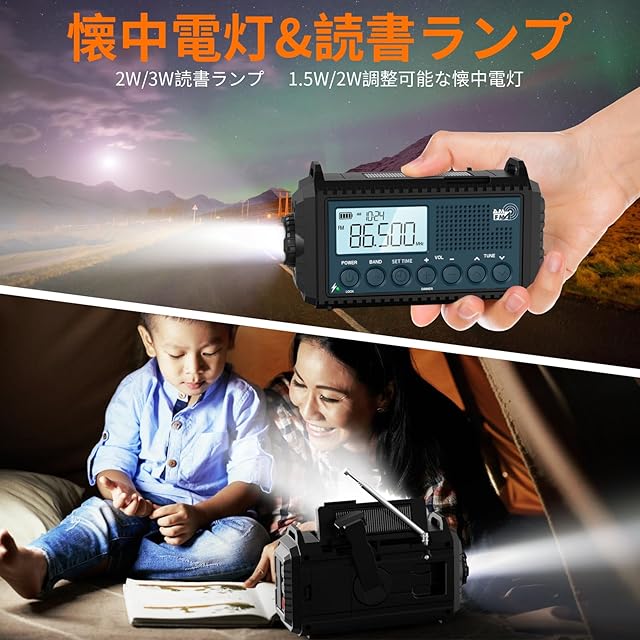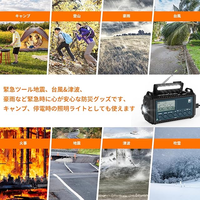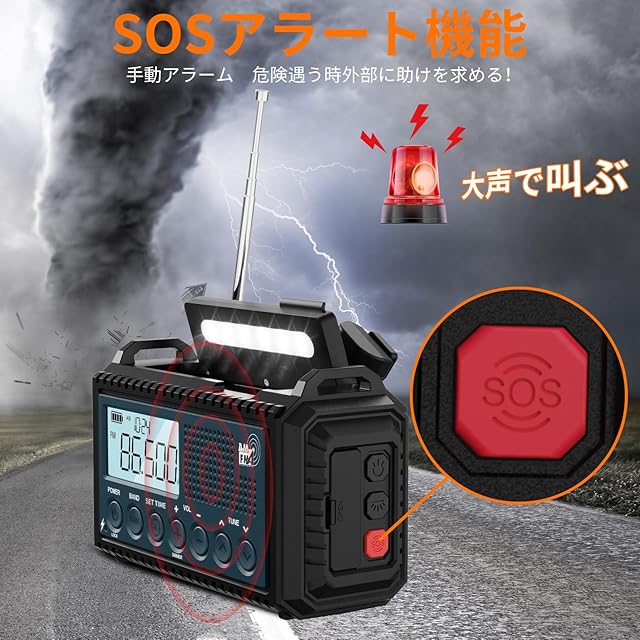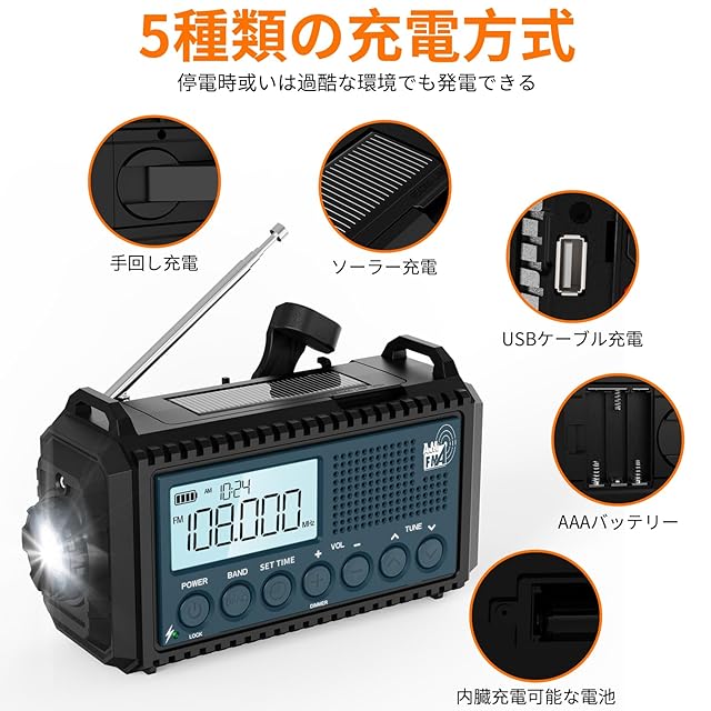 【5000mAh超大容量電池&5つの給電方式、災害などの緊急時に役立ちます】電力を気にしないでください!該当防災ラジオには5つの充電方法があります。ハンドクランク、ソーラーパネル、マイクロUSBケーブル、単4電池(別売)、ACアダプターがバックアップ電源として機能し、防災ラジオをいつでも携帯できるようにします。そしてどこでも!ハンドクランクとソーラーパネルはどちらも、ラジオ、ライト、SOSアラームを必要なときにすぐに使える状態に保つのに十分な電力を再生することができます。充電式電池と単4乾電池3本(別売)で、電力を回生できないときでも確実に電力を供給できます。マイクロUSBケーブルでハンドクランクラジオ(充電式電池は含まれています)を充電できます。 (注:ACアダプターは含まれていません)