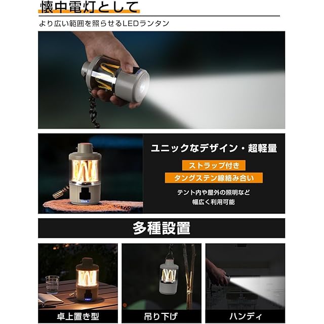 【IP55防水防塵で過酷なアウトドア環境でも安心】:雨やほこりが気になるキャンプ場や登山シーンでも、IP55規格の防水・防塵性能で確実に稼働。突然の雨や砂埃が多い場所でも内部回路を保護し、故障リスクを最小限に抑えます。吊り下げ・手持ち・置き型の3WAY使い分けが可能なデザインは、テント内のメイン照明としても、焚き火周りのサブライトとしても柔軟に活用できます。ソーラーランタンとしての充電機能はありませんが、Type-C端子での急速充電に対応し、満充電時には最大50時間の連続使用が可能。防災グッズとして家庭内の非常用照明としても信頼性を発揮します。