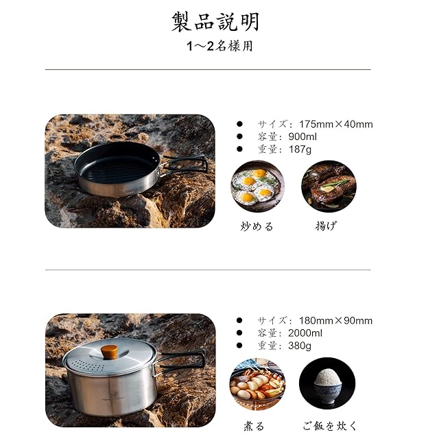 【製品規格とアフターサービス】素材:本体(ステンレス) 重さ:約500g 鍋:直径18cm×高さ9cm フライパン:直径17.5cm×高さ4cm パッケージサイズ:18.4×12.6×18.6cm クッカーセット内容:鍋×1 蓋×1 フライパン×1 収納袋×1 【アフターサービス】我々はお客様に安心してご使用いただけるよう尽力しています。商品受け取り後(30日以内)に、配送ミスや損傷、故障など、何か問題がありましたらすぐにご連絡ください。返品・返金・交換を承ります。写真や実際の商品の色はスタジオで撮影したものですが、お使いのデバイスの設定によって見え方が異なるため、写真とお手元に届く商品が若干異なる場合がございます。ご注文前にサイズ表をご確認ください