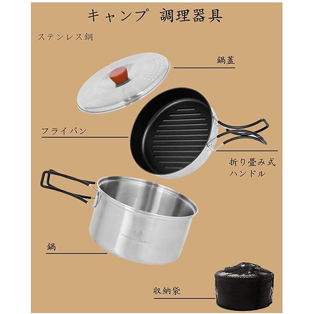 Forest Dawn クッカーセット キャンプ 調理器具 キャンプ用品 一人旅用 アウトドア 超軽量 鍋 こびりつかないフライパン 折りたたみ可能 多機能炊事用具 ih対応 清潔簡単に調理 キャンプ/登山に便利/防災にぴったり 収納袋付 1-2人用 初心者にも経験者にもぴったり ステンレス鋼 食器セット
