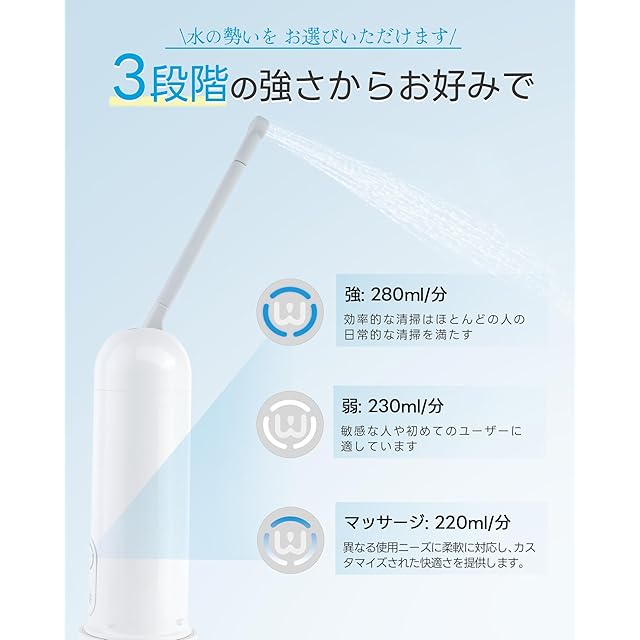 3段階洗浄モードと記憶機能: KN785携帯おしり洗浄器は、弱、強、マッサージの三つのモードが選べ、ニーズに合わせて洗浄力を自由に調節できます。強モードでは水圧が高く、赤ちゃんに適した弱モードは柔らかく洗浄します。使用したモードは記憶され、次回起動時には同じ設定で始めることができるため、おしり洗浄器としての子供向けにも便利です。
