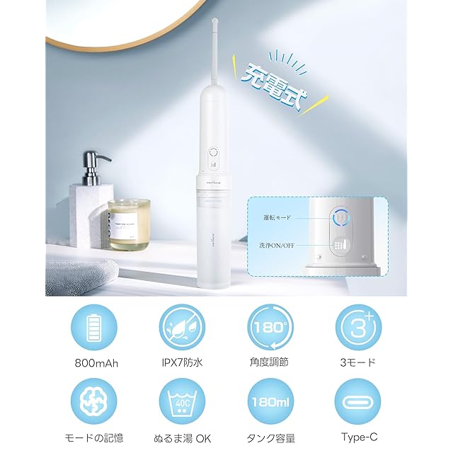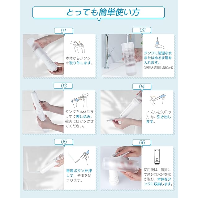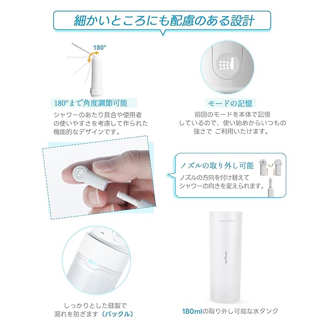 簡単操作と充実の付属品: Keynice携帯洗浄器は180°調整可能なノズルを搭載し、用途や姿勢に合わせて最適な角度で使用できます。操作はシンプルで直感的、分かりやすい取扱説明書も付属しております。パッケージには携帯洗浄器本体、USBケーブル1個、予備ノズル1個、専用袋、クリーニングクロスが全て含まれています。