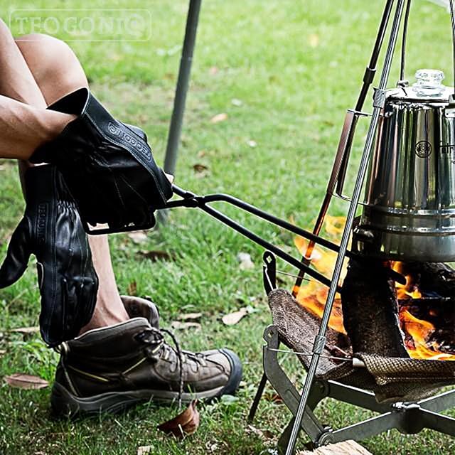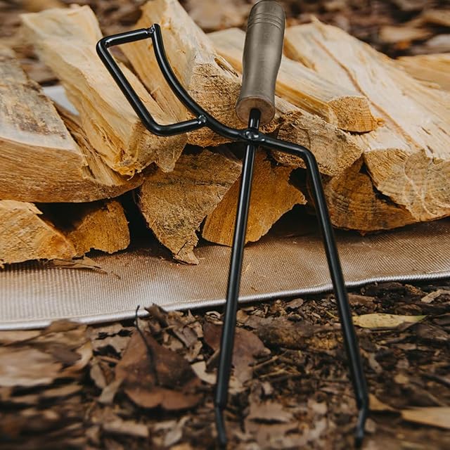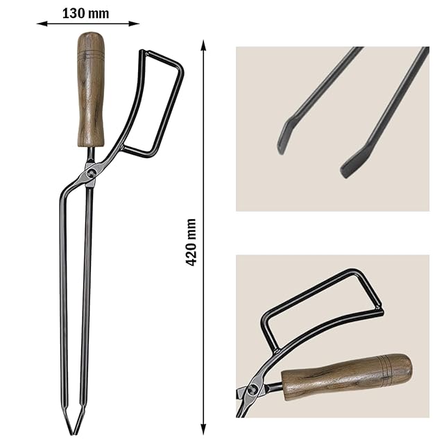 特徴:①極太ステンレス無垢丸棒と天然木を使用。 ②先端は少し幅広で平らになっており、重い薪や小さな木炭を掴むことができます。