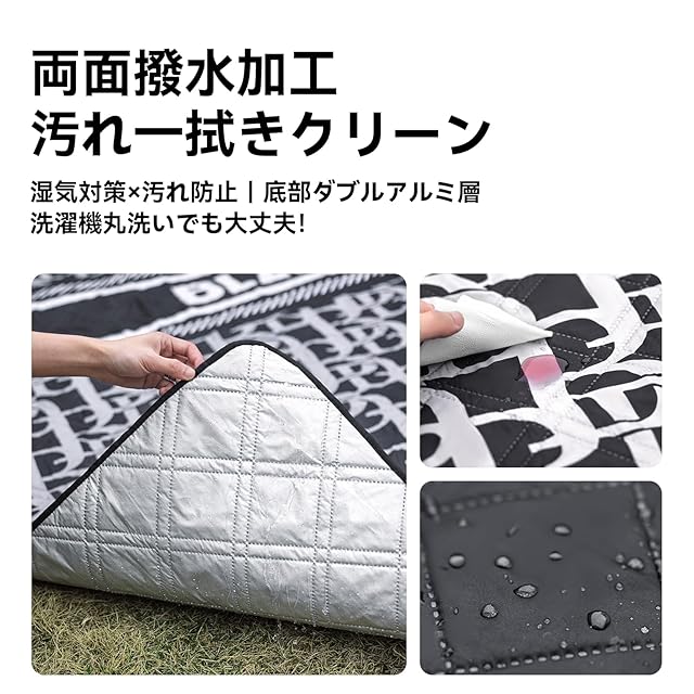 【防水&簡単お手入れ】表面は撥水加工を施しているため、うっかりこぼした飲み物などはサッと拭き取れます。裏面のアルミ蒸着層が地面の湿気を完全にシャットアウト。湿った場所でも安心してご使用いただけます。さらに超音波綿固定技術で、洗濯機での丸洗いが可能!お手入れの負担を軽減します。