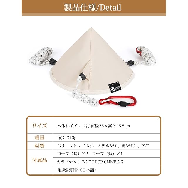 【商品詳細・品質】■カラー:ベージュ ■本体使用サイズ :(約)直径25cm×高さ15.5cm■材質:ポリエステル65%、コットン35%、PVC■付属品:・タープ連結アダプター本体×1・ガイロープ×3・カラビナ×1・取扱説明書(日本語)■総重量:(約)210g■1年間の品質、期間中にご不明な点がある場合、または製品に問題が発生した場合、お気楽にお問い合わせください。