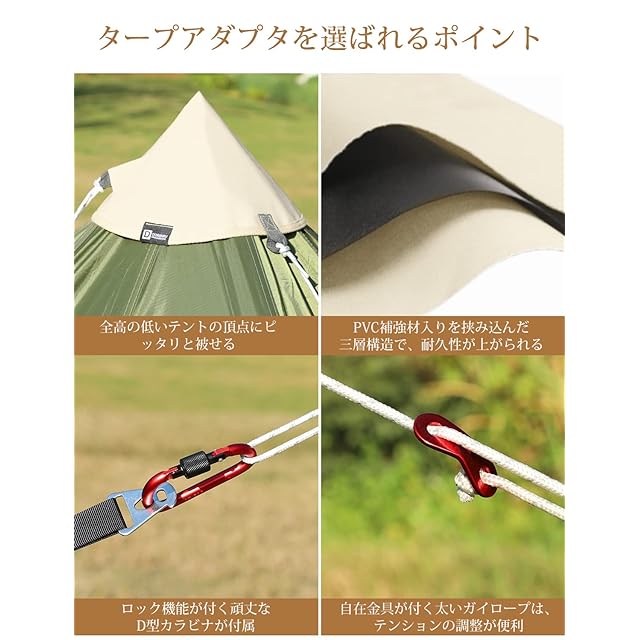 【改良された2つのポイント】①連結アダプターは付属の4mm反射ガイロープがナイロンとポリエステルで作られ、耐摩耗性と引っ張り強度が強い。②タープと繋がるループの位置を、テントハットの底辺から中部の位置に移したので、設営時の安定性が高めました。テントを立ち上げる際に、連結アダプターは頂点から落ちにくい。