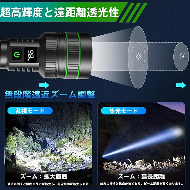【新型超高輝度と遠距離&実用的なled輝度】この明るいLED懐中電灯は一つ高性能の LEDを採用し、明る高出力を提供できます!そして、最適化新設計された用PMMA大リフレクターを使用、懐中電灯は非常に優れた集光機能を備えて、照射距離最大9900メートルに達します。暗闇でも広範囲を明るく照らし出すことができます。狩猟、サバイバル、災害対策、仕事、旅行、捜索などの場合にも大活躍ですア。