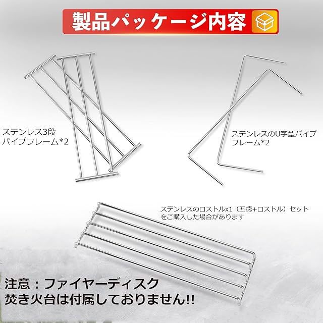 【製品内容】ステンレス304の3段パイプレーム*2、ステンレス304のU字型パイプレーム*2、ステンレス304のロストル*1、※ファイアーディスク(焚き火台)が含まれませんので、別途ご用意ください。