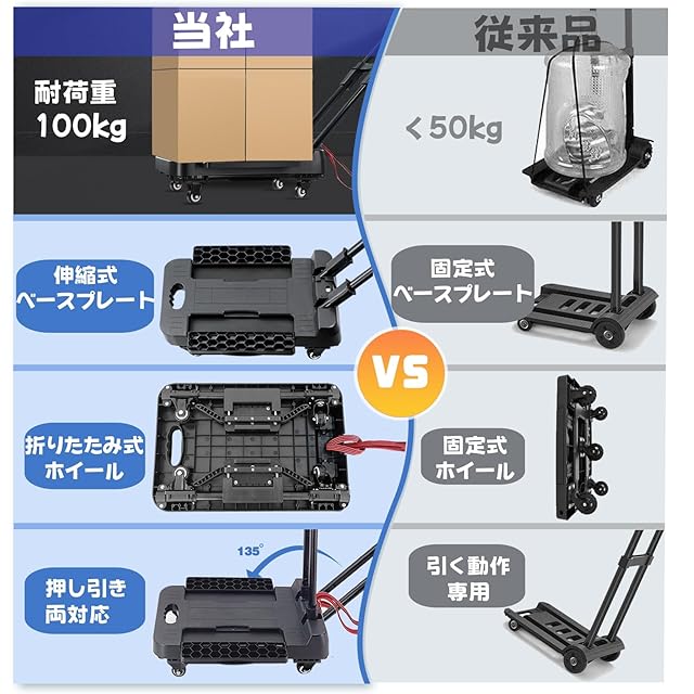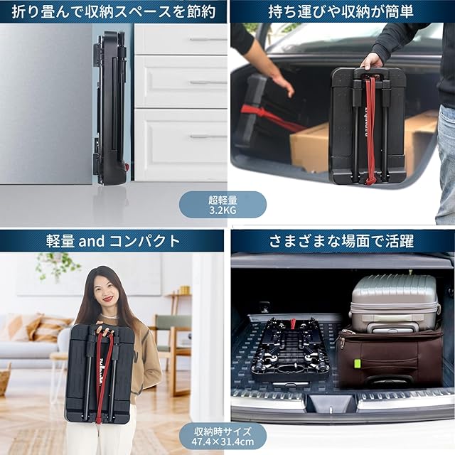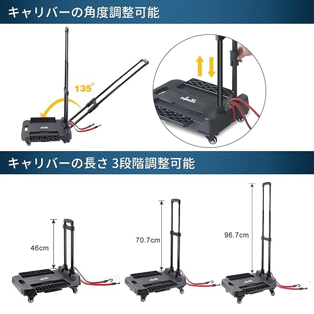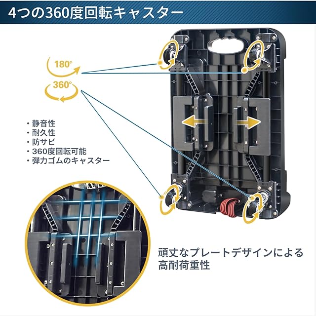 【★耐荷重100kgで幅広く活躍★】耐荷重100kgの頑丈な設計で、宅配物、家具、クーラーボックス、ポリタンクなどの重い荷物も軽々と運べます。引越し、旅行、ショッピング、アウトドア、イベントなど、さまざまなシーンで大活躍。荷物固定用コードを付属し、不安定な荷物もしっかり固定可能。荷崩れや落下のリスクを軽減し、安全に運搬できる