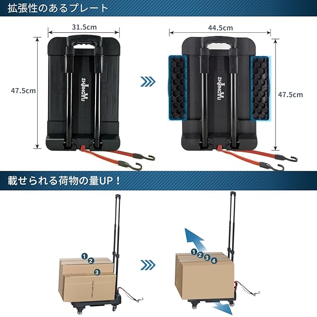ZHJINGYU 台車 耐荷重100KG キャリーカート 折りたたみ式 プレート拡張可能 静音 キャリーバー調整135度 固定ゴムロープ付 伸縮 荷物 運搬 キャスター折り畳み式