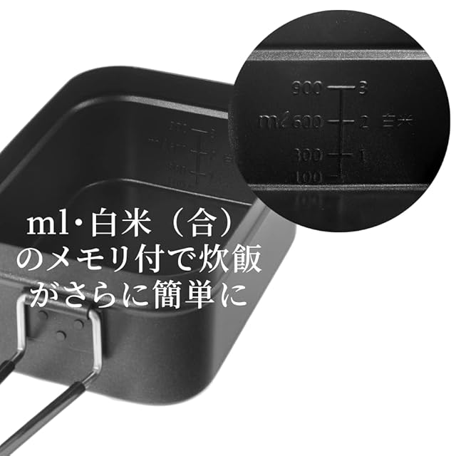 【便利な目盛り付き】メスティン内側に、ml・白米(合)のメモリを打刻しています。 面倒な計量・計量カップの持ち運びは不要!更に炊飯が簡単になりました。