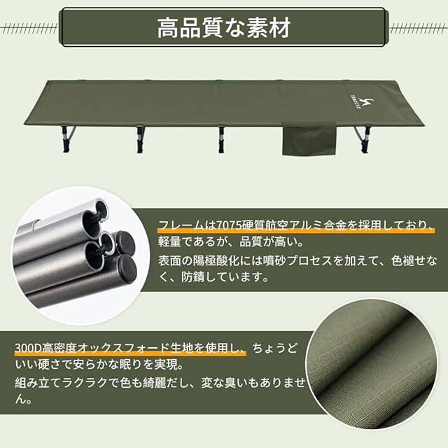 コット幅が広くで快適:お客様のニーズに合わせて、ベッドのサイズを大きくしたり、地面からの冷気を遮断するために地面からの高さを高くしたりしています。 他のベッドに比べて幅が広くて余裕で寝返りできる。また、キャンピングコットを使用することで、地面の凹凸による疲れた睡眠を防ぐことができます。キャンプ場では質の高い睡眠をとることができます。【!!!注意:グリーンモデルには枕を入れるポケットがありません!!!!】