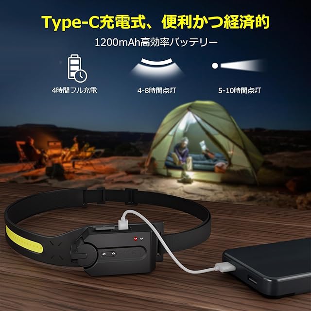 【USB Type-C急速充電・長時間点灯可能】LEDヘッドライトはUSB Type-C充電に対応しており、環境に優しく、頻繁なバッテリー交換の必要はありません。1,200mAhの高品質バッテリーを搭載し、最大9時間の連続点灯が可能です。