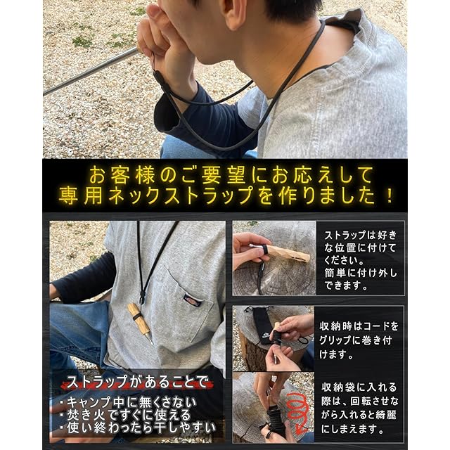 【ストラップ、説明書、収納袋、キャンプステッカーが付属】お客様のご要望にお応えして、火吹き棒を無くさないためのストラップを付属しました。火起こしに慣れていない方でも使えるように、動画解説付きの取扱説明書があります。しまうときに便利な収納袋付き。120mm×35mmの防水キャンプステッカーもおまけで付いてきます。