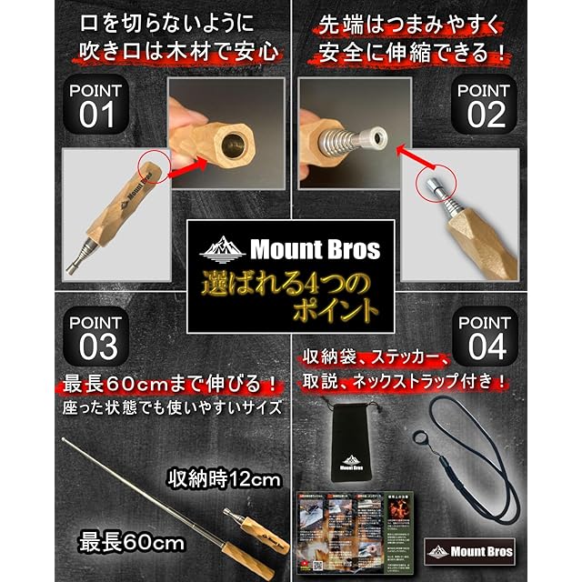 MountBros 火吹き棒 【キャンプのプロ推薦】 ふいご ファイヤーブラスター 最小12cm 最長60cm 伸縮式 コンパクト ストラップ 半年返品 セット